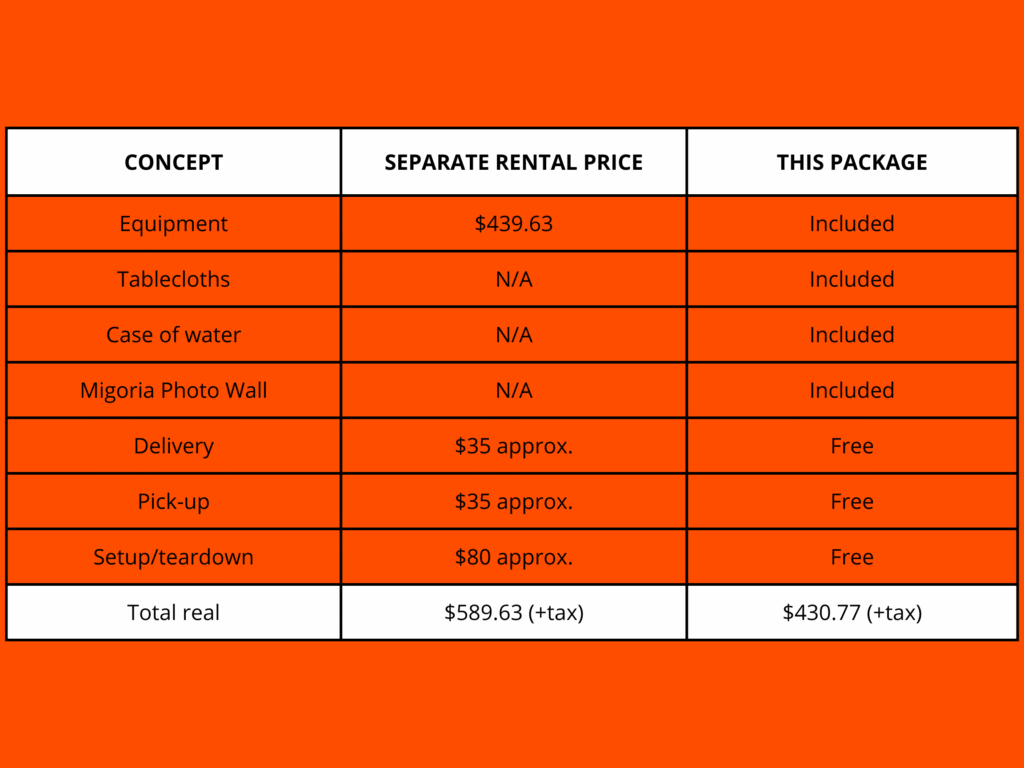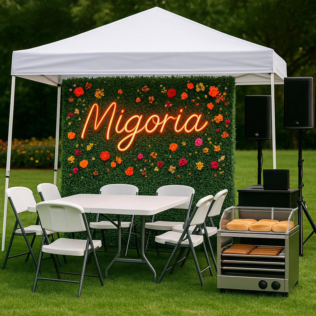 “Our Premium Package has everything for a spectacular, worry-free event: Migoria Beverage Station, Migoria Hot Dog Station, exclusive Migoria Photo Wall, elegant 13×26 ft tent, tables with tablecloths, sturdy chairs, powerful audio system with microphone, and built-in safety features. Delivery, pick up and setup are free!”
