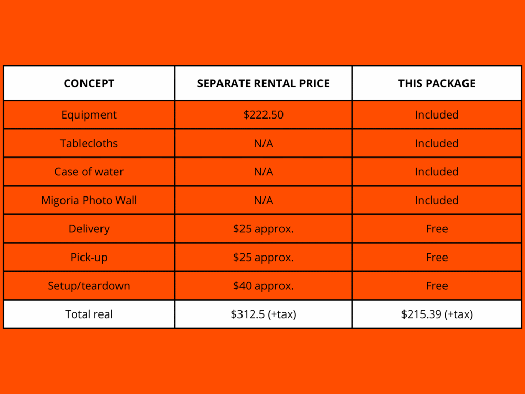 “This basic package includes tables with their tablecloths and chairs. In addition, you can choose between our audio system or the hot dog machine in its basic version (Migoria Hot Dog Station, described below). And as a special bonus, you’ll also receive Migoria’s photo wall for free.”